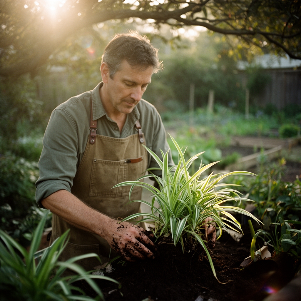 The dense crown of an overgrown spider plant (Chlorophytum comosum) collapses under its own weight, roots circling the pot's interior in a strangled mass. Leaves yellow at the base. New plantlets dangle on stolons with nowhere to root. These are the signals that division is no longer optional. The steps for dividing an overgrown spider plant restore vigor by separating congested rhizomes, redistributing auxin flow, and giving each division access to fresh substrate with functional cation exchange capacity.